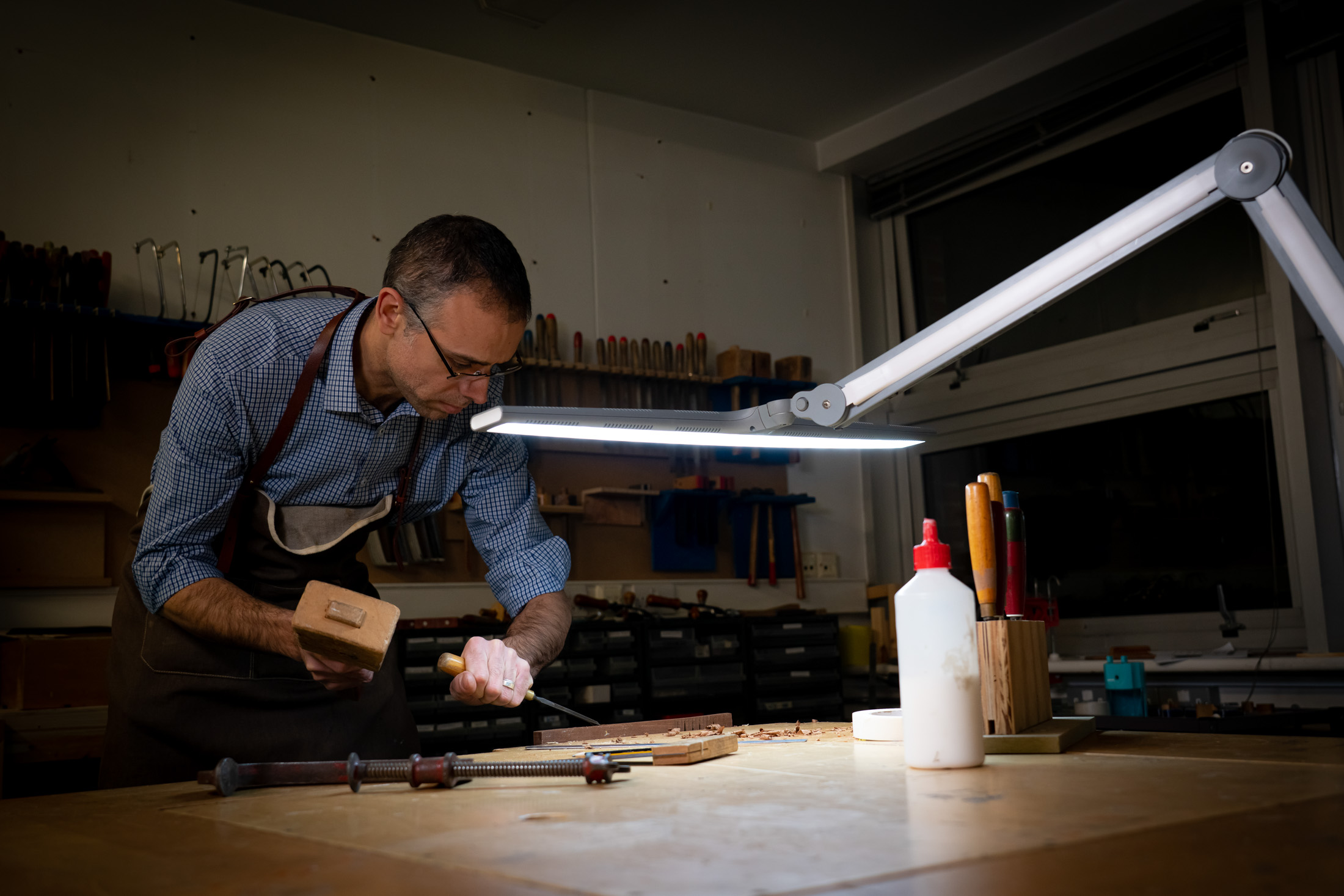 Die Luminos Klemmleuchte wurde für den professionellen Einsatz entwickelt und bietet eine außergewöhnlich breite Lichtverteilung auf großen Arbeitsflächen. In ihrem extrabreiten Schirm befinden sich 120 leistungsstarke Tageslicht-LEDs mit einem CRI von 95+, die für eine genaue Farbanpassung und eine geringere Belastung der Augen sorgen.