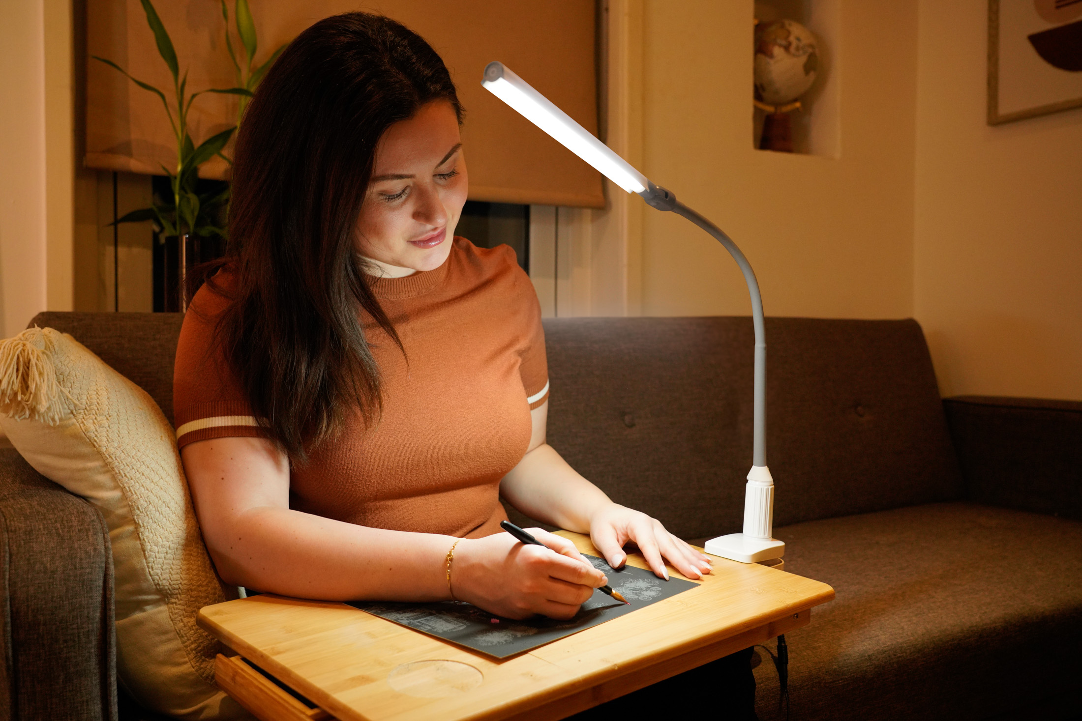 Light up your workspace with our UnoPro Clamp Lamp, a bright and flexible lamp with high-quality daylight LEDs and 95+ CRI for true tone colours. The anti-glare shade allows for a more ergonomic work environment, along with the pivoting head joint and soft touch flexible arm to direct the light wherever you need it.